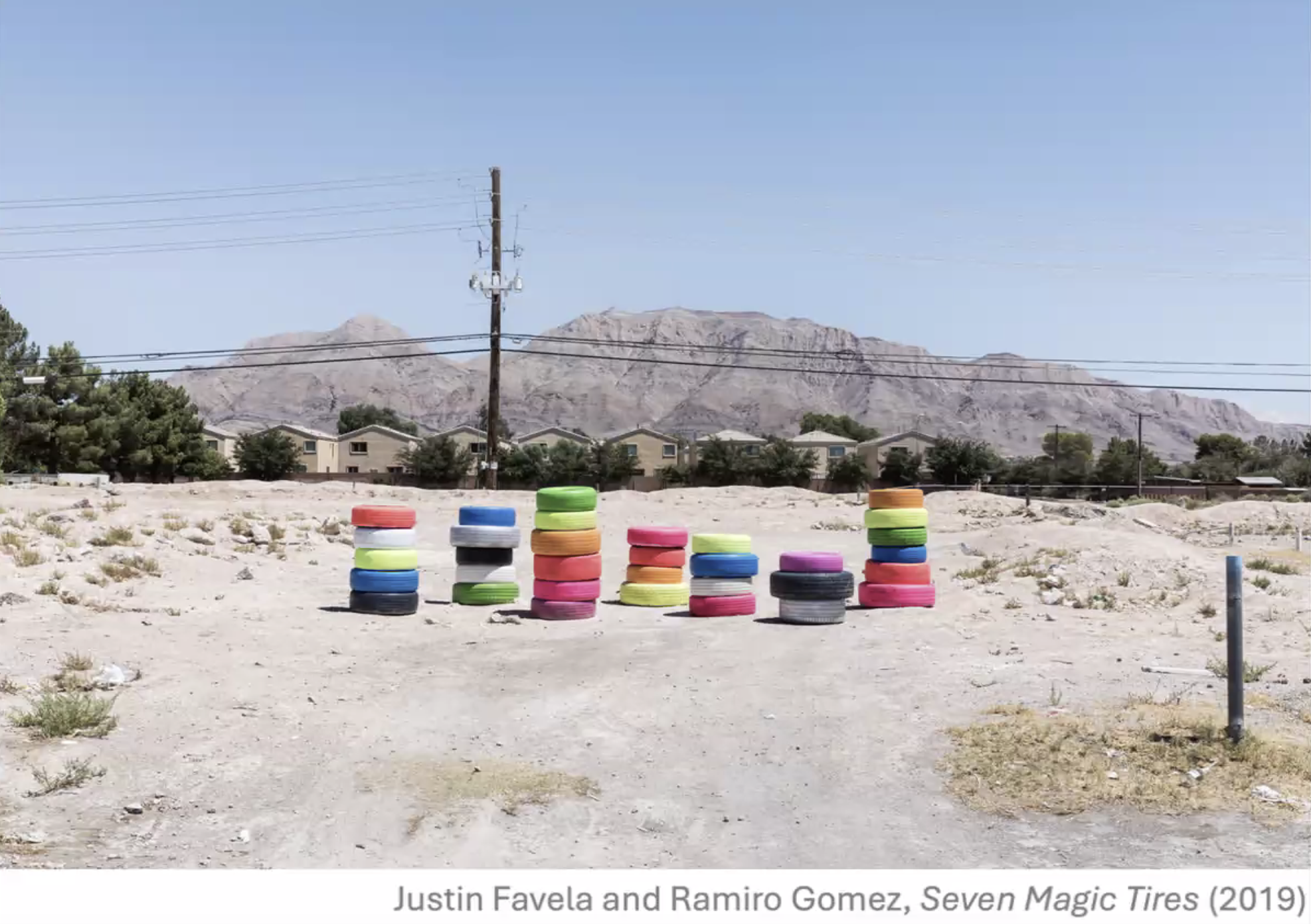 Sommige landschapskunstwerken brengen deze koloniale dimensie juist onder de aandacht. Een sprekend voorbeeld is Never Forget van Nicholas Galanin uit 2021, waarbij de beroemde Hollywood-letters in Los Angeles zijn nagemaakt, maar nu met de tekst ‘Indian Land’, om duidelijk te maken dat op de plek van Hollywood oorspronkelijk een ander volk woonde. Ook in het werk van Imani Jacqueline Brown komt dit koloniale aspect geregeld naar voren, zoals in If toxic air is a monument for slavery, how do we tear it down, waarbij zij op landkaarten laat zien hoe luchtvervuiling en het toe-eigenen van land met elkaar samenhangen.
